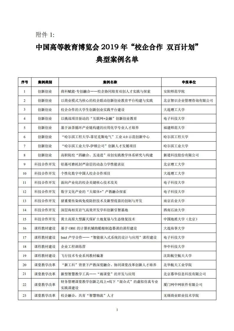 中国高等教育博览会2019年“校企合作 双百计划”典型案例推选认定结果公示中国高等教育博览会昨天根据《关于启动中国高等教育博览会“校企合作 双百计划”工作的通知》(高学会〔2019〕83号)和《关于中国高等教育博览会“校企合作 双百计划”申报工作的补充通知》(高学会〔2019〕98号)要求,中国高等教育学会于2019年5月启动了中国高等教育博览会“校企合作 双百计划”典型案例推选工作,经资格审核、通讯推选、会议推选、路演展示等环节,拟将59所申报高校、企业的74项案例认定为2019年“校企合作 双百计划”典型案例(名单见附件1),并在“中国高等教育博览会”等微信公众号进行宣传推广活动,请入选高校、企业按照附件2填报相关内容。